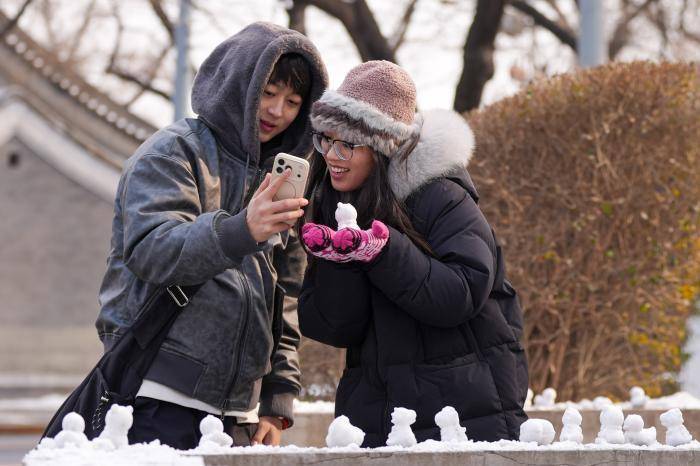 1月18日,人们在北京景山东街路边与“迷你”雪人合影。新华社记者 谢晗 摄