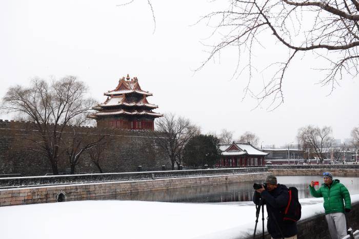 1月18日,人们在故宫角楼附近拍摄雪景。新华社发(王跃武 摄)