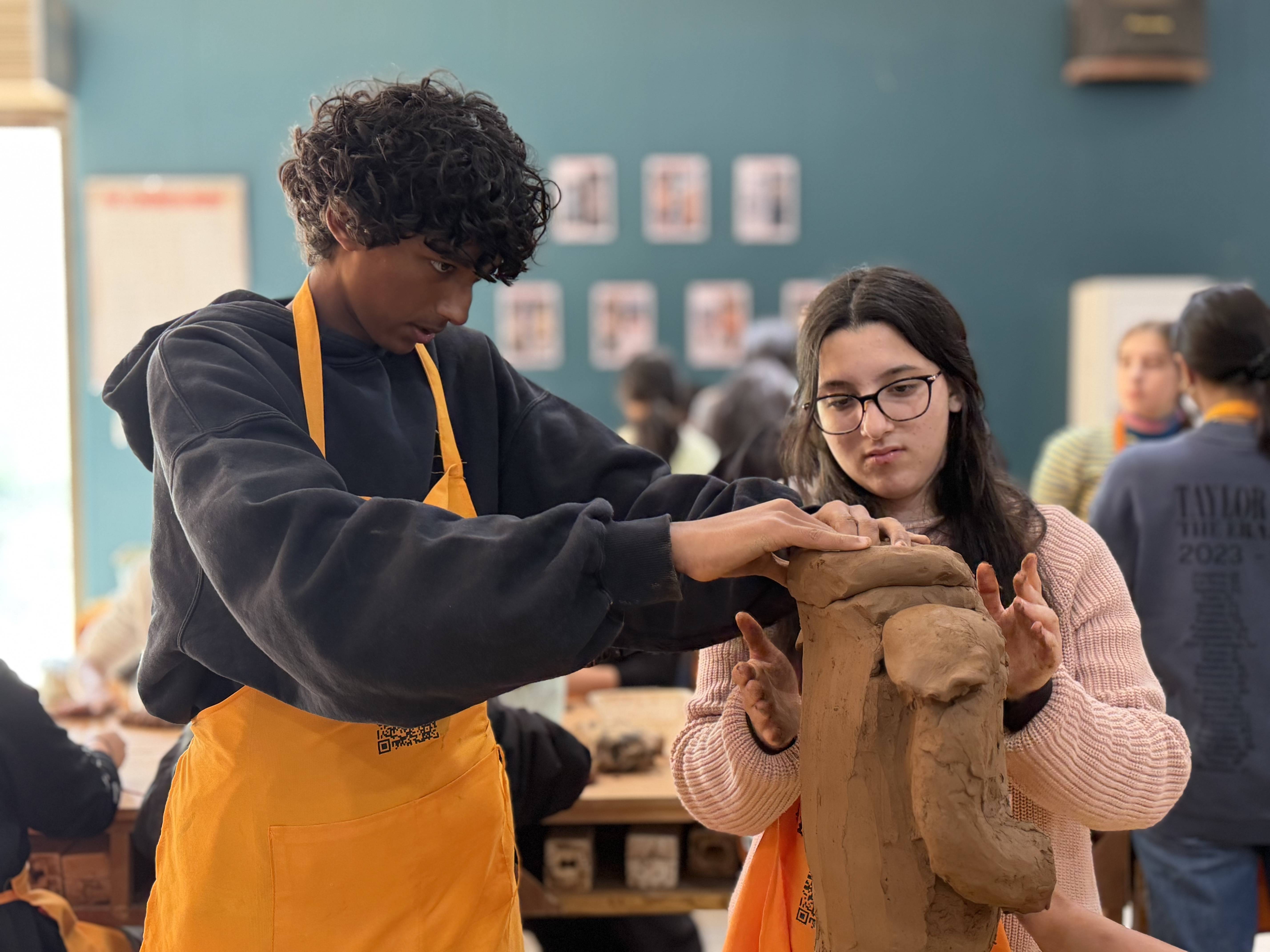 角落里,一个少年忽然举手:“老师,快来帮帮我,我的‘兵马俑’快塌了!”韩咪快步上前,帮他把泥条扶正、收窄、压实。