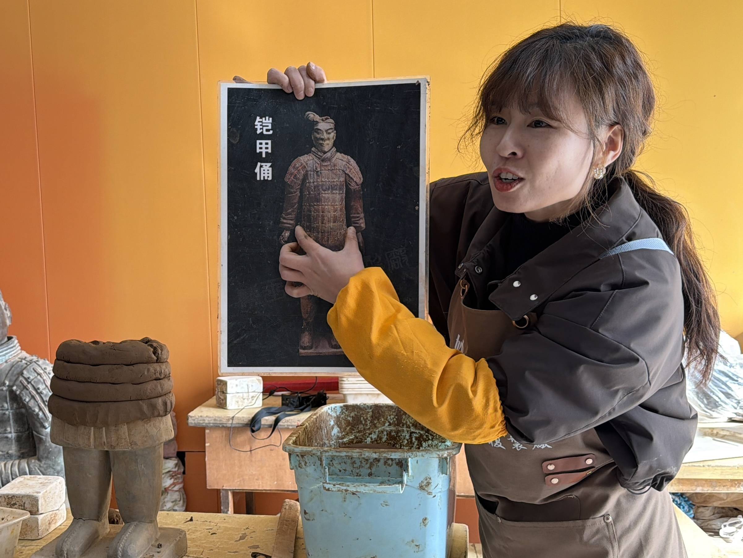韩咪正在讲解陶俑制作工艺。新华社记者蔡馨逸 摄只见她拿出一根约两指宽的光滑泥条,盘在提前准备好的陶俑腿部底座上,双手按压紧实。“这是取自陕西关中地区地下7至9米的红黏土,和秦代工匠手中的泥出自同一片土地。”她说。