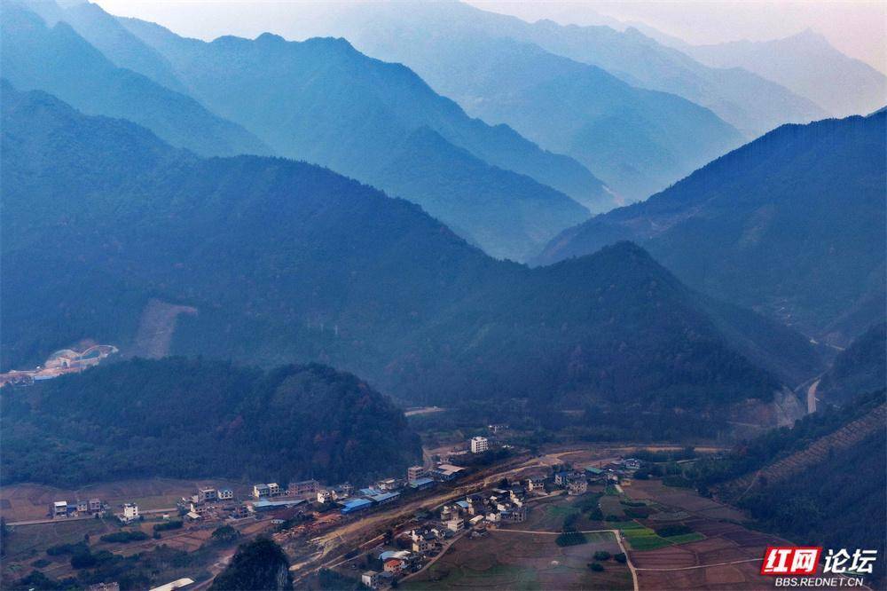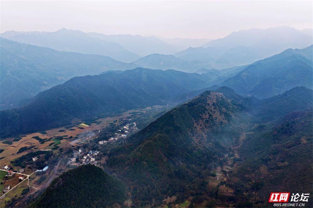 青瓦屋顶错落铺展,红蓝点缀其间,窄巷弯曲,仿佛能听见时光走过的声音。小河如玉带蜿蜒,穿过田野,绕过屋舍,波光里倒映着生活的朴素与安宁。田块拼成大地色板,深绿、褐黄、青蓝……是作物,也是季节的诗行。偶尔有车驶过公路,现代痕迹轻轻融入,却不扰这一方千年山水。瑶乡人就在这云雾与青山之间,春种秋收,炊烟袅袅,静守着一份与自然相融的烟火气。