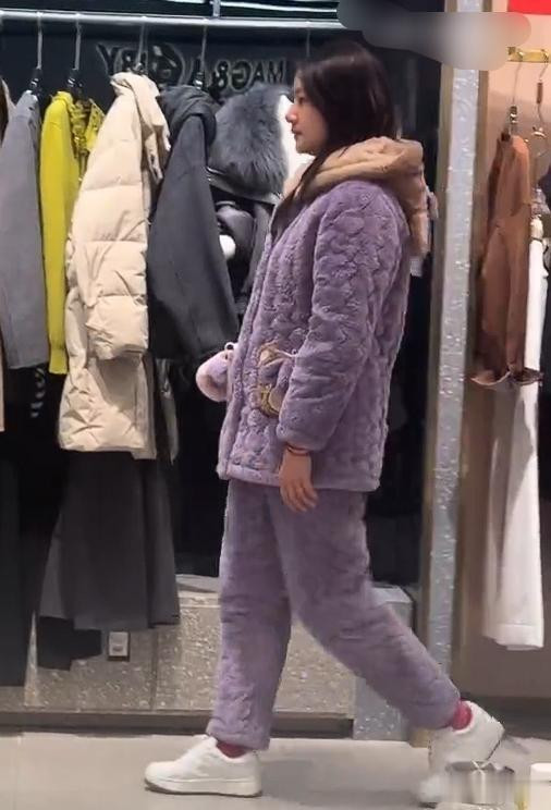 春节期间她回湖南常德老家过年,有路人偶遇她穿着紫色夹棉湖南省服,素颜扎着丸子头逛街。
