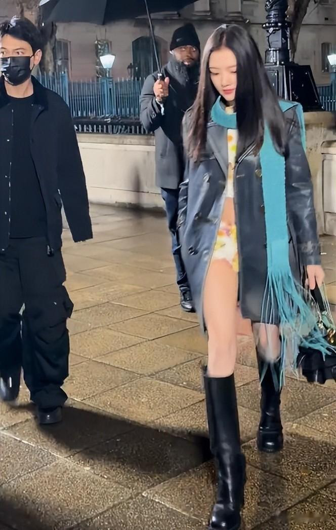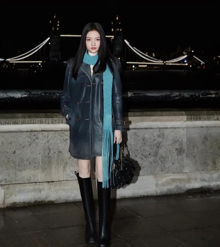 她一袭深蓝色收腰牛仔风衣搭配湖蓝色钩针围巾,踩着高筒靴亮相,黑长直的发型衬得她头肩比格外优越。