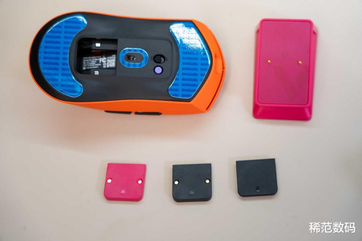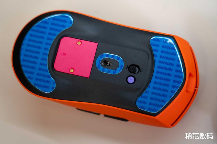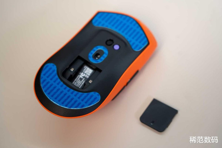 另看VT7焰影橙鼠标尺寸不小,但它的重量控制在53g左右。它的减重秘决是通过自研的“极客之芯2.0”模块化PCBA,将主板面积减少39%、因此重量减轻33%。这是设计结构的极限挑战。 要知道,这么轻巧的重量里还塞进了800mAh的超大电池。