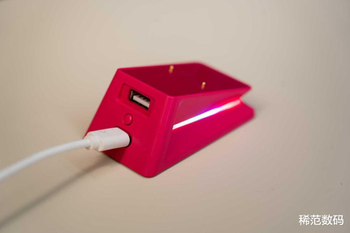 替换上这个粉色的带触点的盖子后,就可以更方便的桌面充电了。
