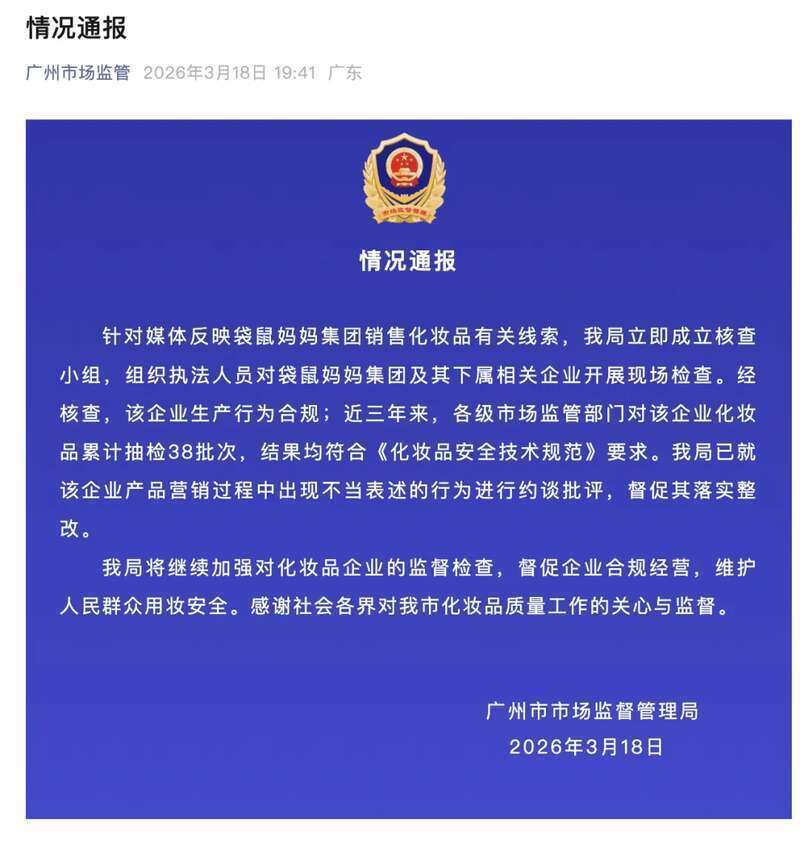 针对媒体反映袋鼠妈妈集团销售化妆品有关线索,该局立即成立核查小组,组织执法人员对袋鼠妈妈集团及其下属相关企业开展现场检查。经核查,该企业生产行为合规;近三年来,各级市场监管部门对该企业化妆品累计抽检38批次,结果均符合《化妆品安全技术规范》要求。该局已就该企业产品营销过程中出现不当表述的行为进行约谈批评,督促其落实整改。