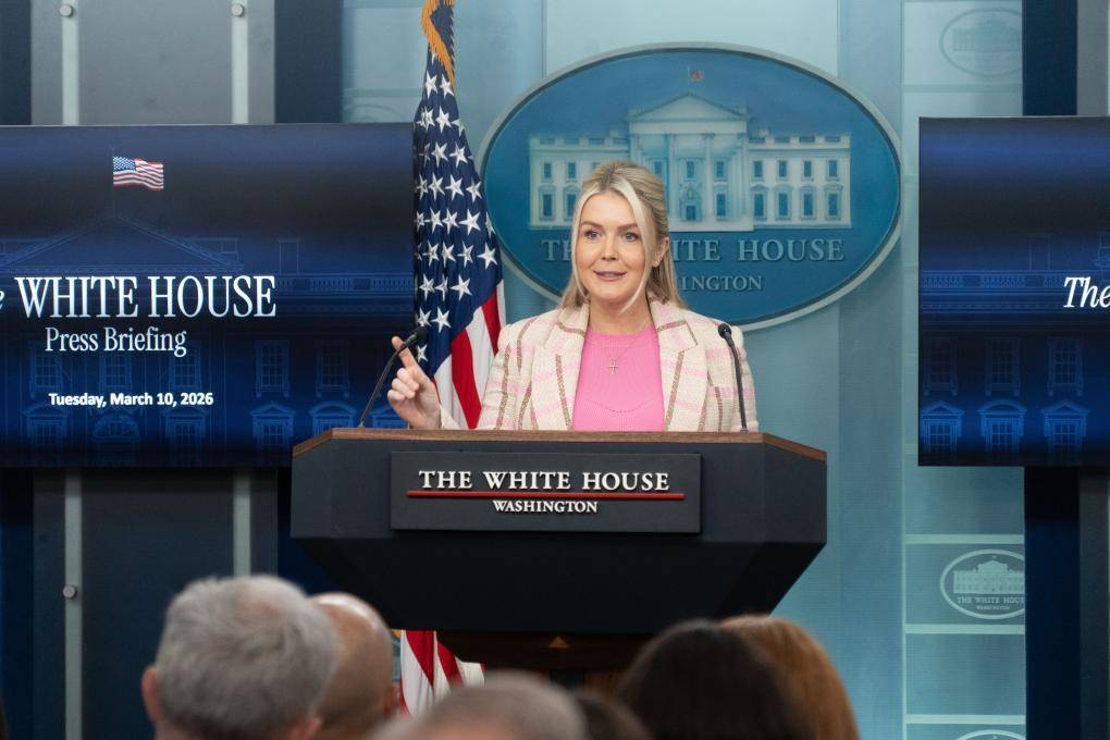 3月10日,在美国首都华盛顿,白宫新闻秘书莱维特出席记者会。新华社发(李源清摄)