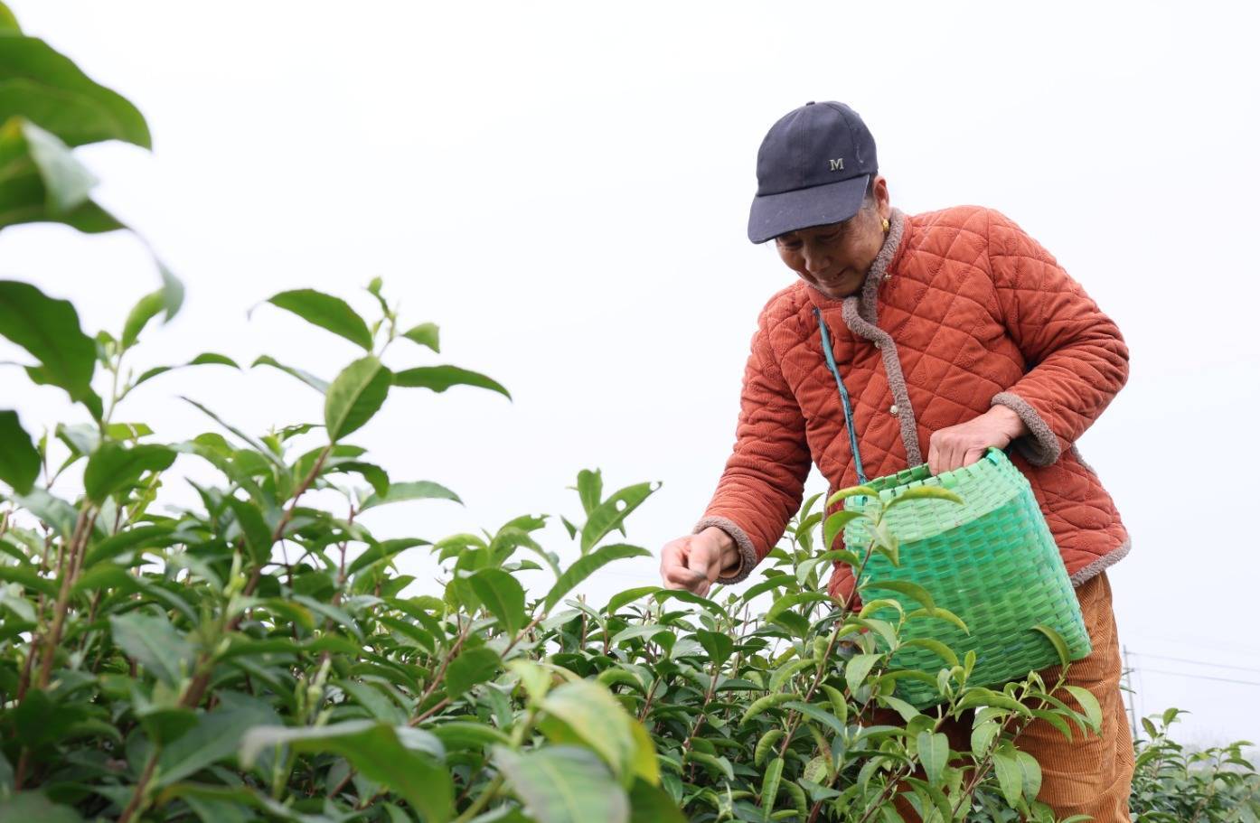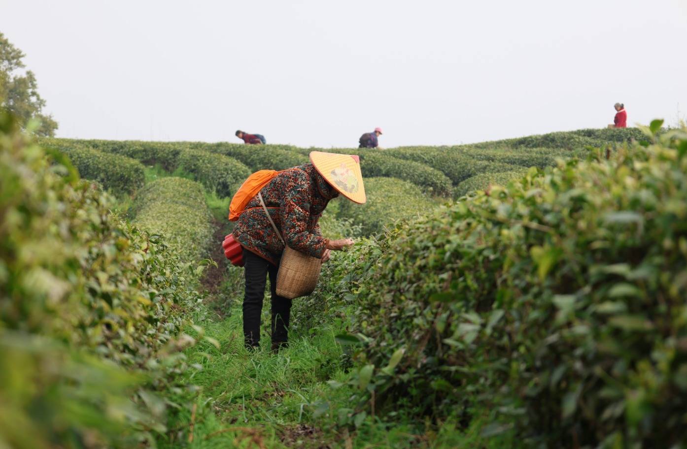 临近中午,阳光变得有些晃眼。采茶工们的茶篓已经有些分量了,嫩绿的芽叶在篓底铺了厚厚一层,透着清新的茶香。
